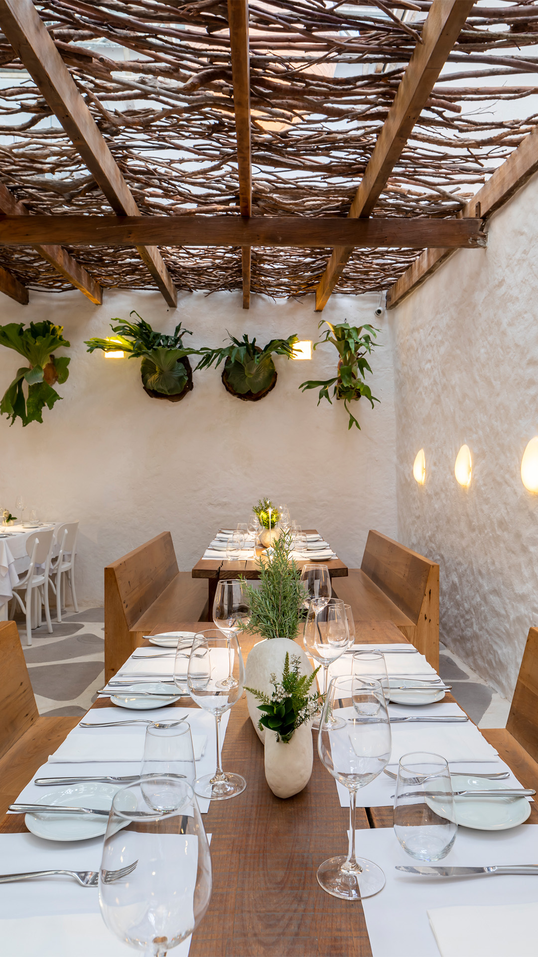 Com conceito e interiores pensados por Mariana Kraemer, designer autora do projeto original, em parceria com o arquiteto Daniel Fromer, o Maní tem ambientes abertos e integrados, fluídos e acolhedores. Os pergolados com galhos de jabuticabeira, as estruturas de madeira de demolição e as paredes de textura manual que remetem ao imaginário rural brasileiro são alguns dos traços identitários da estética do restaurante. O piso de rocha natural da Serra Gaúcha recobre o corredor de entrada, o primeiro e o último salão.